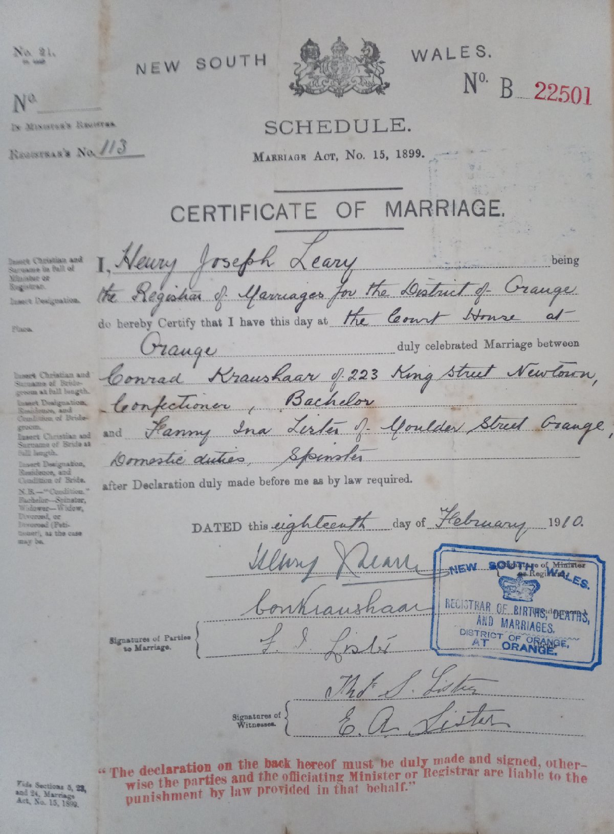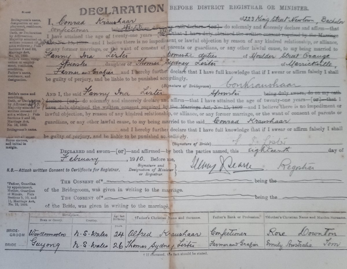 Conrad Kraushaar (later Crawshaw) marries Fanny Ina ("Dot") Lister